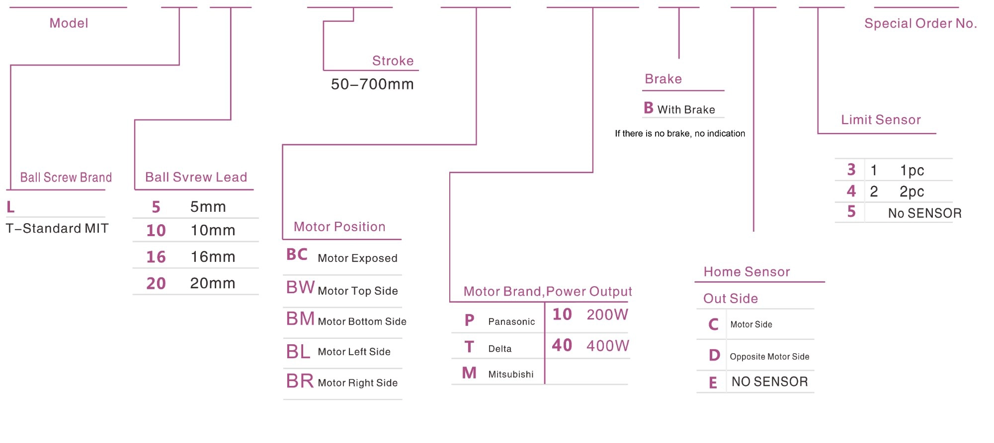 | Kullanım Alanı | Sürüş Modu | Model Özellikleri | Motor Çıkışı (w) | Genişlik (mm) | Tekrarlanabilirlik (mm) | Bilyalı Vida Özellikleri | Maksimum Yük Kapasitesi (kg) | Maksimum hız (mm/s) *1 | ||