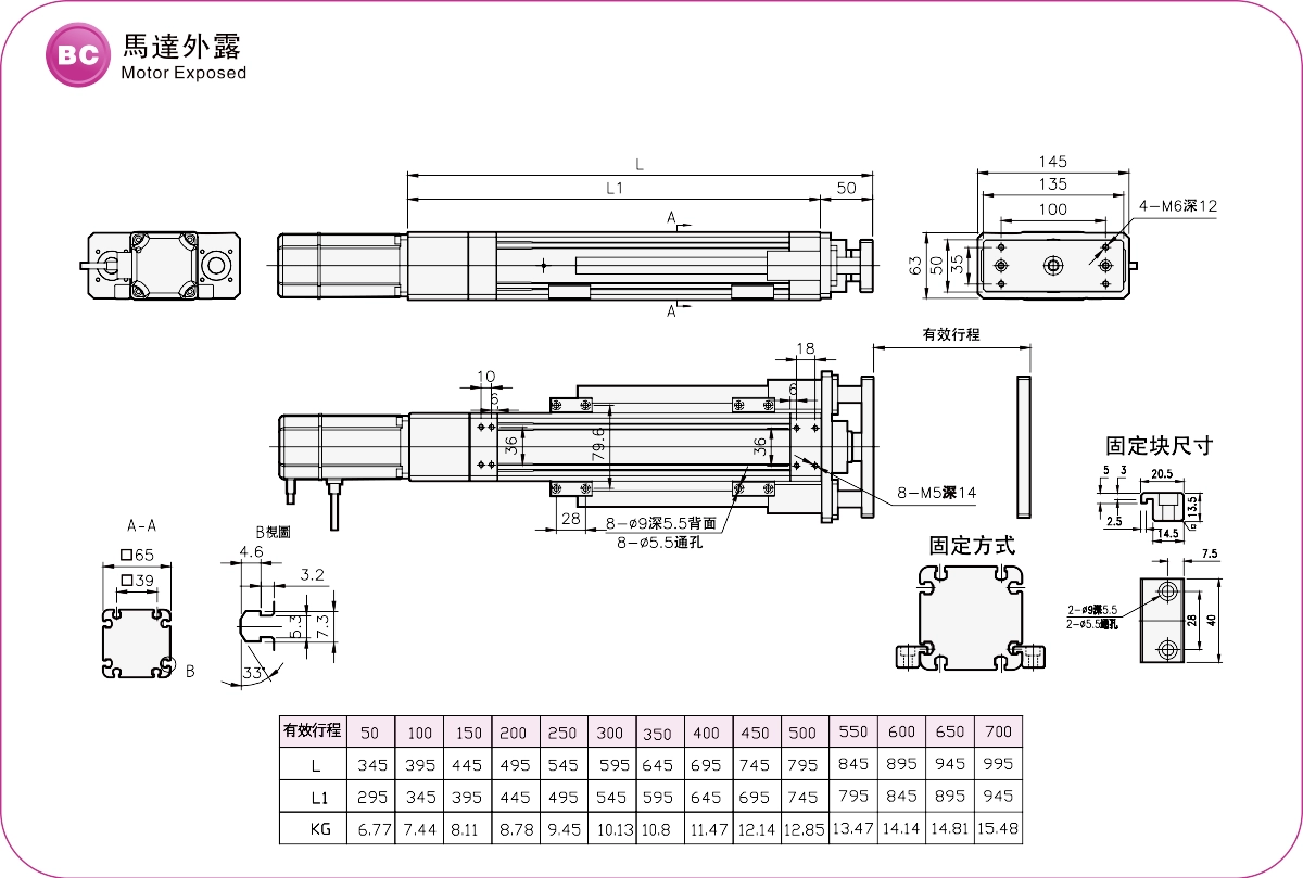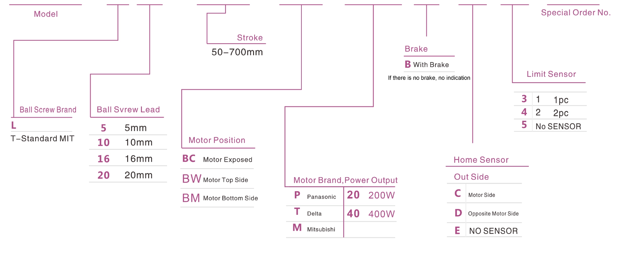 | Kullanım Alanı | Sürüş Modu | Model Özellikleri | Motor Çıkışı (w) | Genişlik (mm) | Tekrarlanabilirlik (mm) | Bilyalı Vida Özellikleri | Maksimum Yük Kapasitesi (kg) | Maksimum hız (mm/s) *1 | ||
