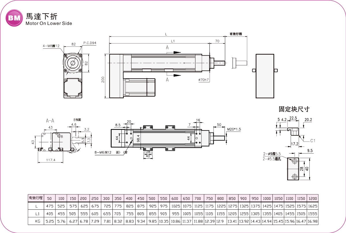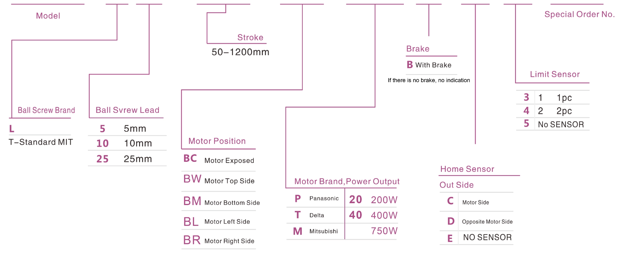 | Kullanım Alanı | Sürüş Modu | Model Özellikleri | Motor Çıkışı (w) | Genişlik (mm) | Tekrarlanabilirlik (mm) | Bilyalı Vida Özellikleri | Maksimum Yük Kapasitesi (kg) | Maksimum hız (mm/s) *1 | ||