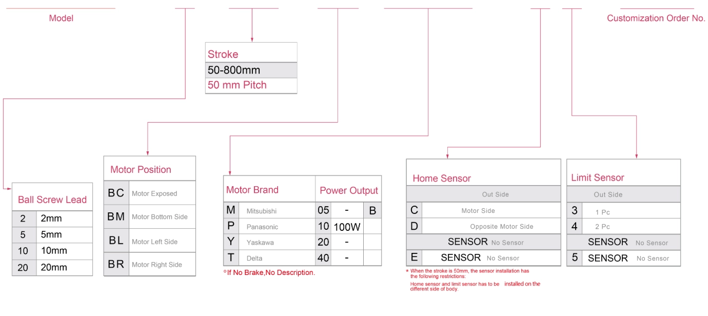 | Kullanım Alanı | Sürüş Modu | Model Özellikleri | Motor Çıkışı (w) | Genişlik (mm) | Tekrarlanabilirlik (mm) | Bilyalı Vida Özellikleri | Maksimum Yük Kapasitesi (kg) | Maksimum hız (mm/s) *1 | ||