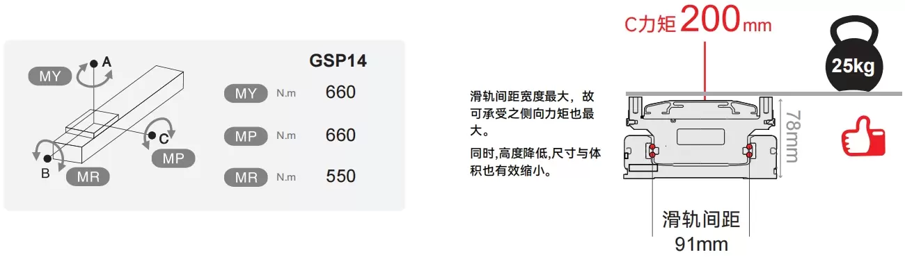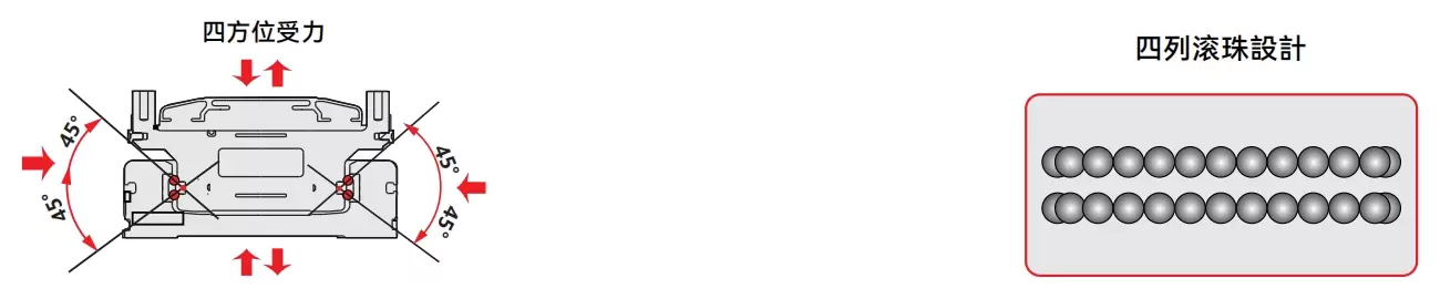 Yüksek rijitlik, yüksek hassasiyet, düşük sürtünme, yüksek hızlı hareket, yüksek yük kapasitesi, uzun ömür, boşluksuz yapı, hafif ve çevik hareket ve "kavisli oluğa" hareket ederken uzun süre yüksek hassasiyeti koruma kolaylığı. İç kaydırıcının dört yönünde de aynı nominal yükü elde edebilir ve her yönde kullanılabilir.
