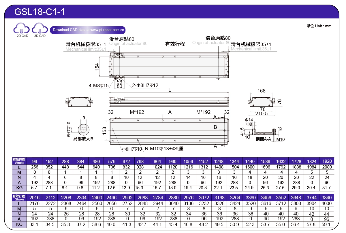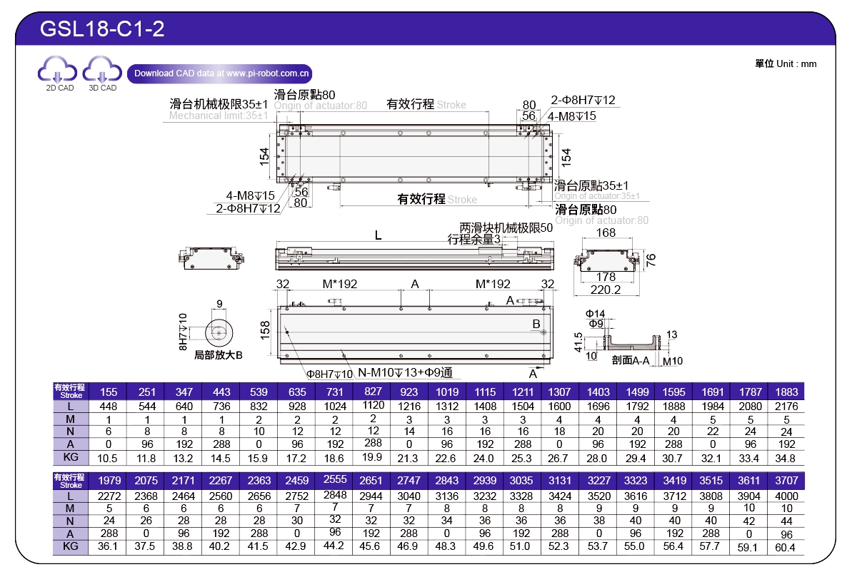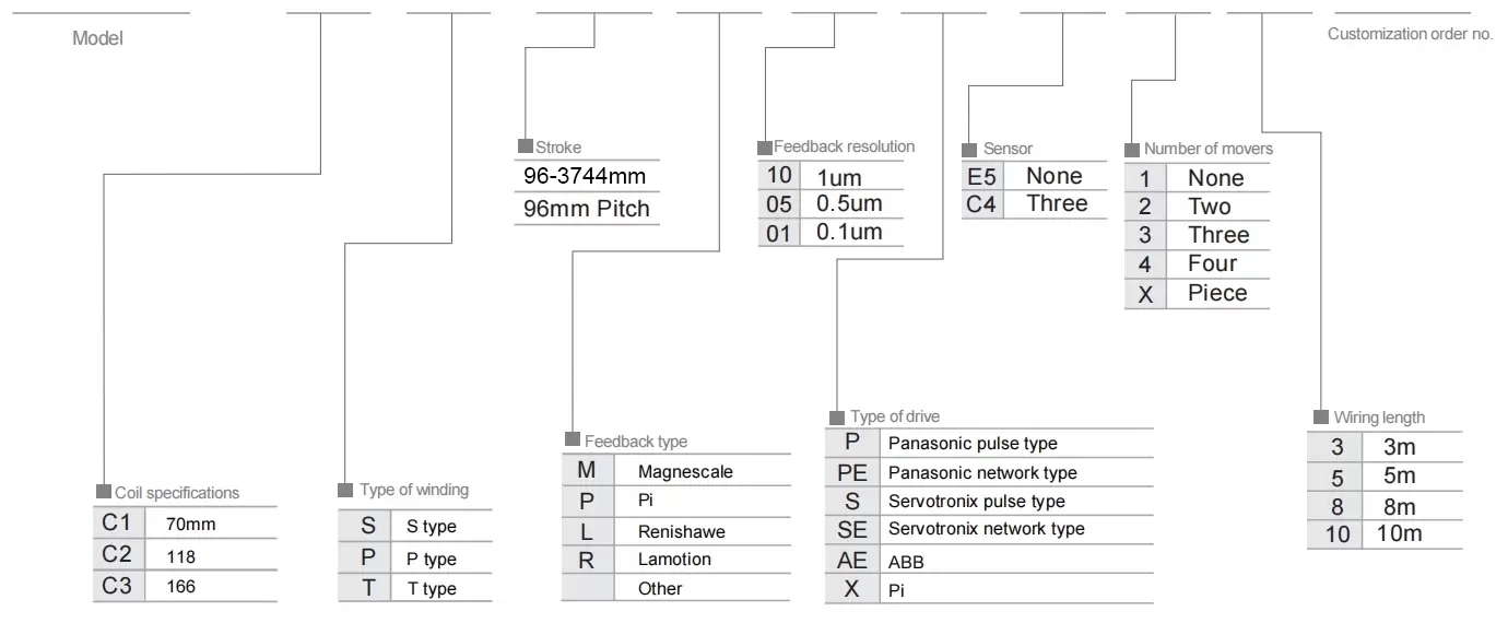 | Kullanım Alanı | Sürüş Modu | Model Özellikleri | Motor Özellikleri | Gövdenin genişliği (mm) | Gövdenin yüksekliği (mm) | Tekrarlanabilirlik (mm) | Sürekli itme (N) | Tepe itme kuvveti (N) | lrms(A) | Maksimum Yük Kapasitesi (kg) | Maksimum hız (mm/s) *1 |