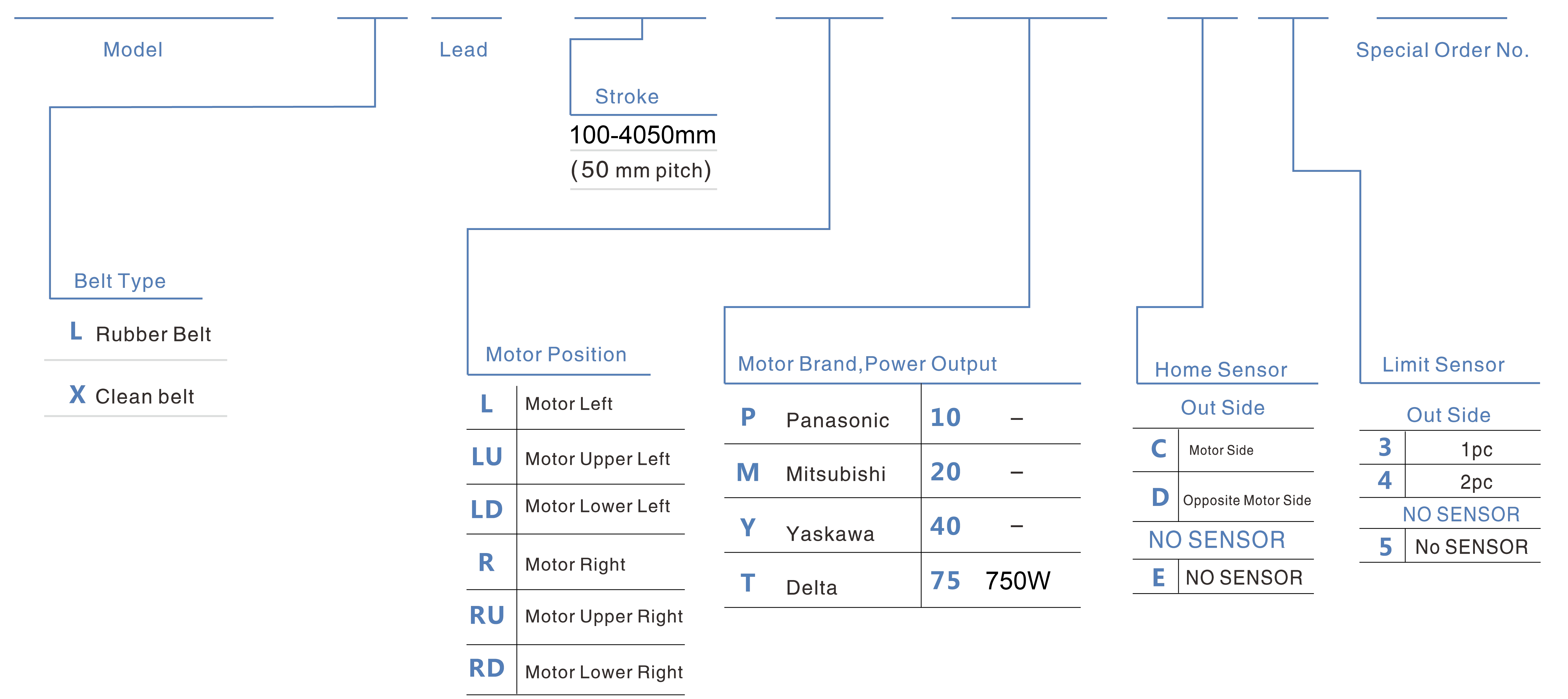 | Kullanım Alanı | Sürüş Modu | Model Özellikleri | İndirgeyici Mekanizma | Motor Çıkışı (w) | Genişlik (mm) | Tekrarlanabilirlik (mm) | Kayış özellikleri | Maksimum Yük Kapasitesi (kg) | Maksimum hız (mm/s) *1 | ||