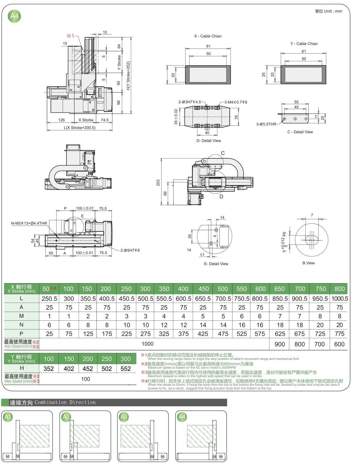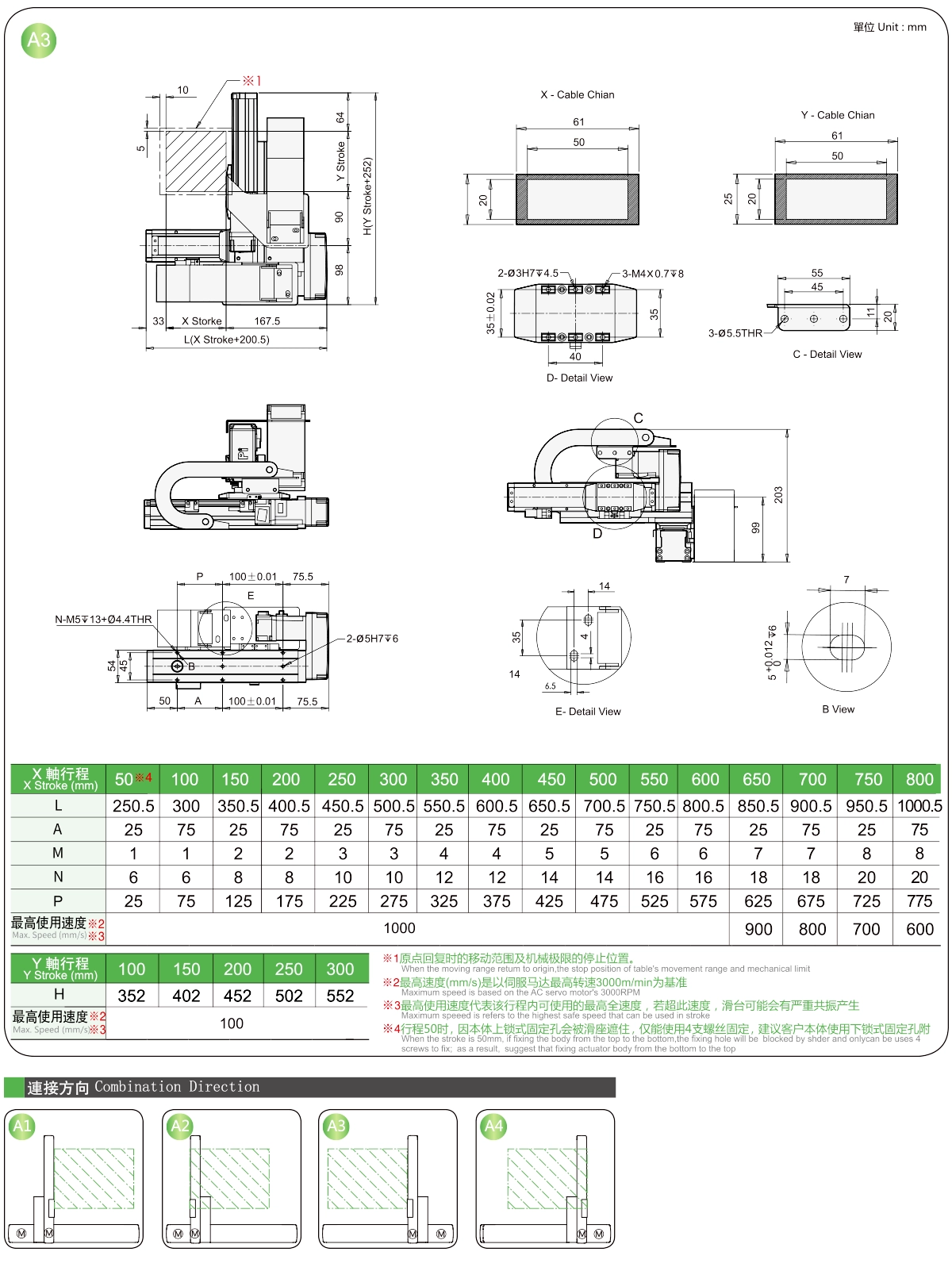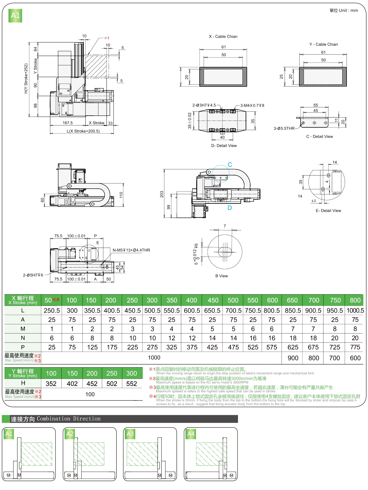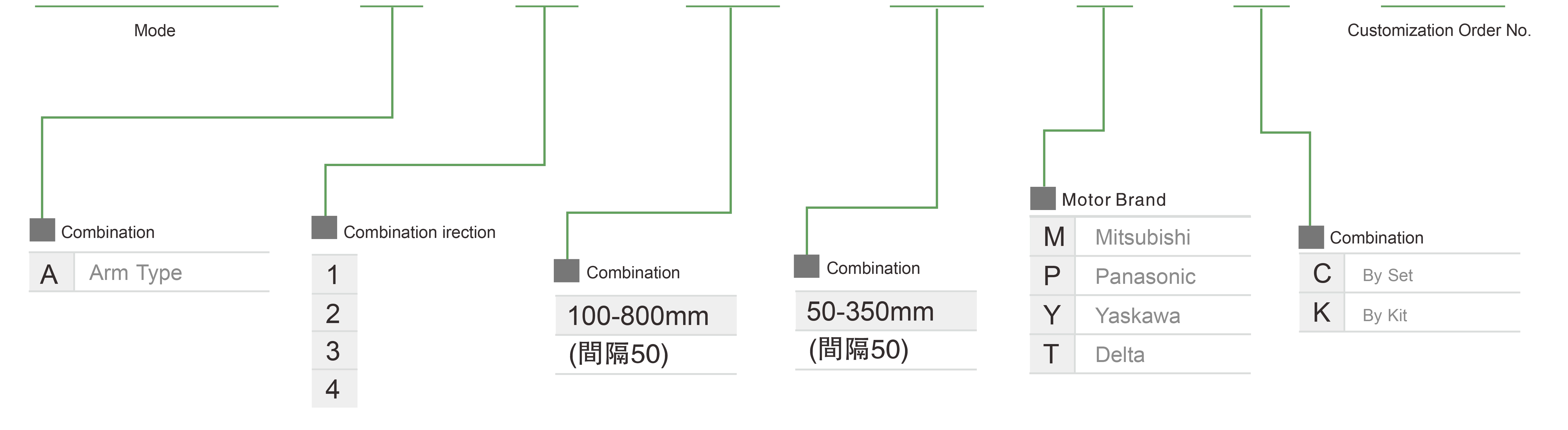 | Kullanım Alanı | Sürüş Modu | Model Özellikleri | Kombinasyon | Eksen Numaraları | Yol göstermek | Maksimum hız (mm/s) | Strok (mm) | ||||||