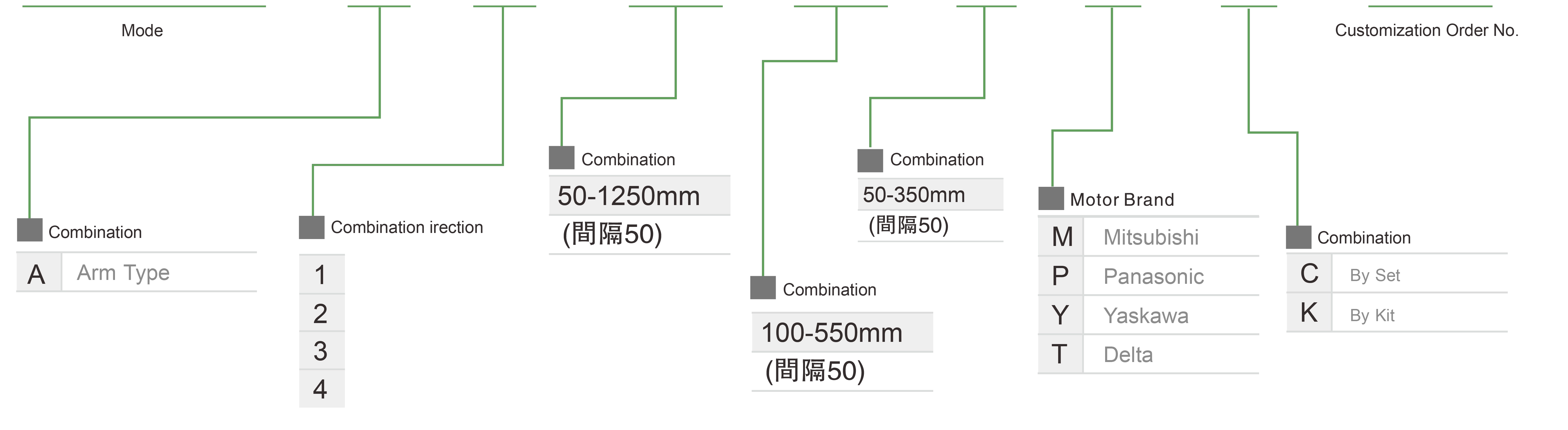 | Kullanım Alanı | Sürüş Modu | Model Özellikleri | Kombinasyon | Eksen Numaraları | Yol göstermek | Maksimum hız (mm/s) | Strok (mm) | ||||||