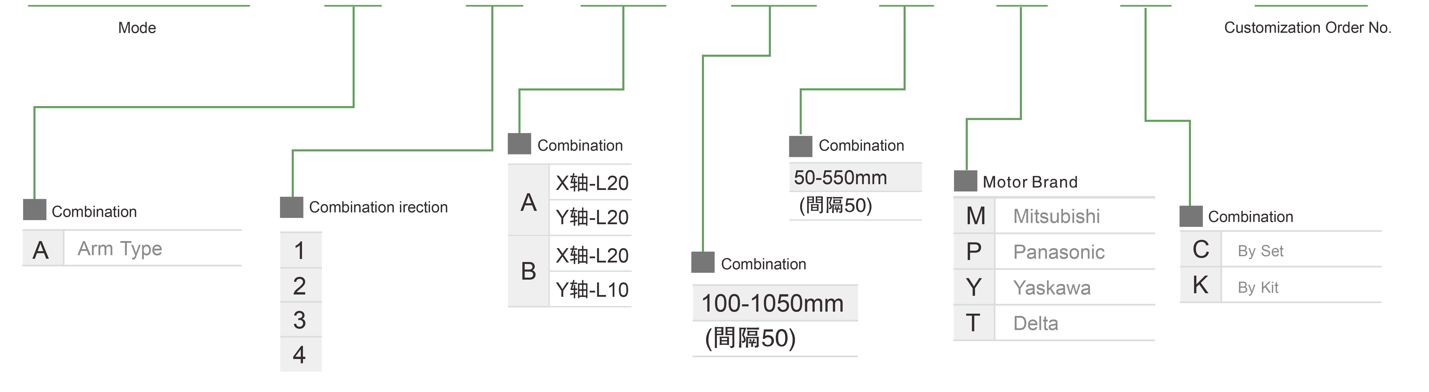 | Kullanım Alanı | Sürüş Modu | Model Özellikleri | Kombinasyon | Eksen Numaraları | Yol göstermek | Maksimum hız (mm/s) | Strok (mm) | ||||||