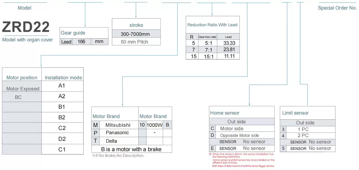 | Kullanım Alanı | Sürüş Modu | Model Özellikleri | Motor Çıkışı (w) | Genişlik (mm) | Tekrarlanabilirlik (mm) | Azaltıcıların oranı | Helisel dişli boyutu (mm) | Maksimum Yük Kapasitesi (kg) | Maksimum hız (mm/s) *1 | |||