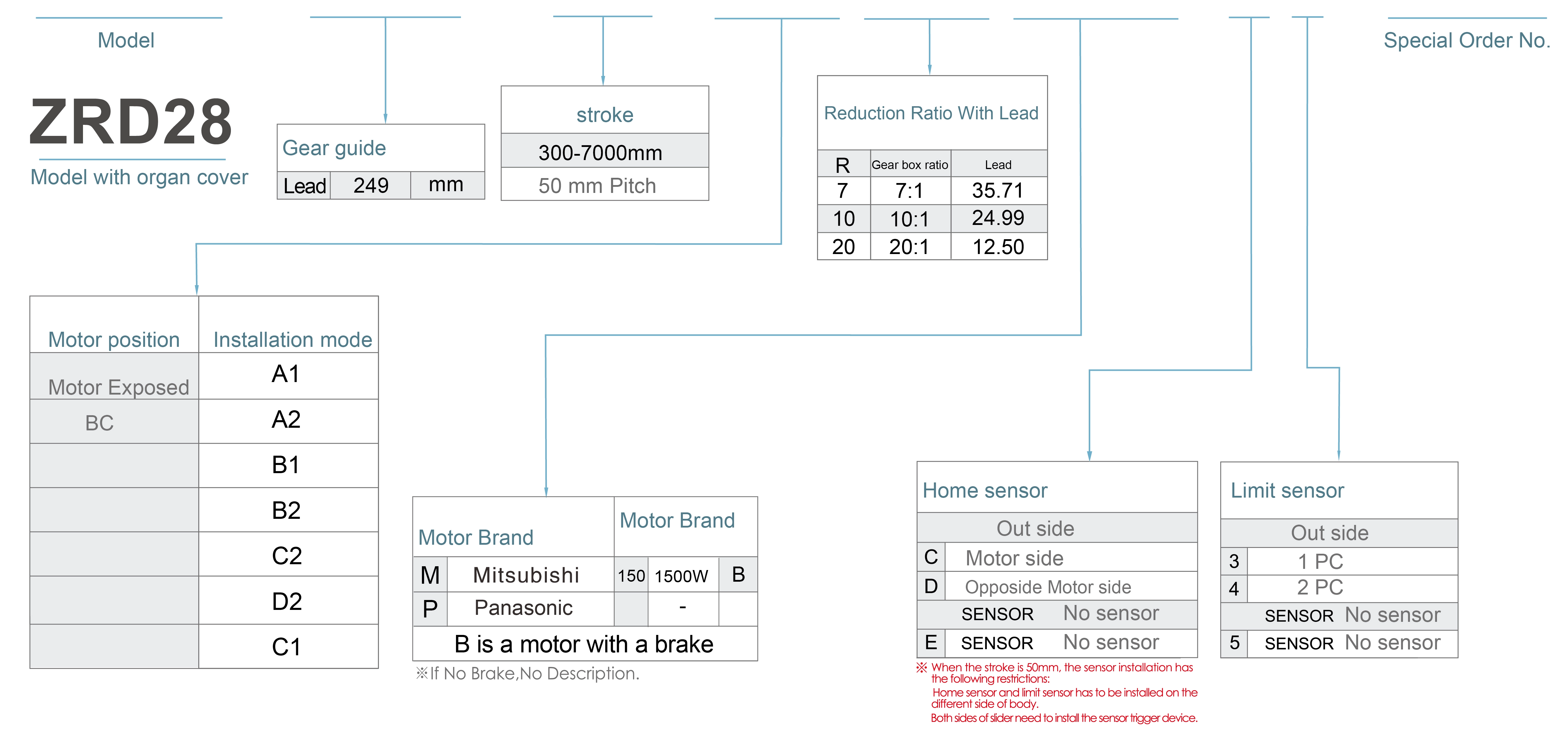 | Kullanım Alanı | Sürüş Modu | Model Özellikleri | Motor Çıkışı (w) | Genişlik (mm) | Tekrarlanabilirlik (mm) | Azaltıcıların oranı | Helisel dişli boyutu (mm) | Maksimum Yük Kapasitesi (kg) | Maksimum hız (mm/s) *1 | |||